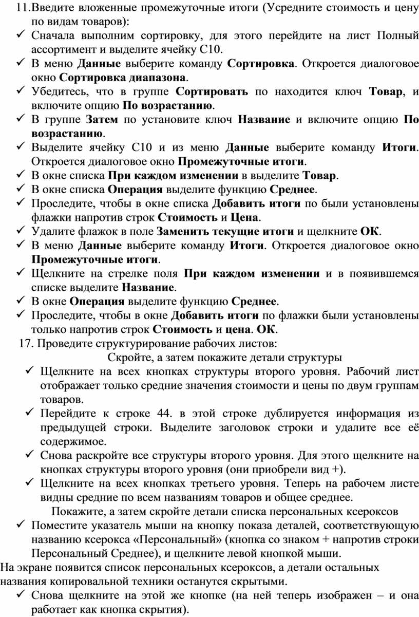 18. Введите вложенные промежуточные итоги (Усредните стоимость и цену по видам товаров):