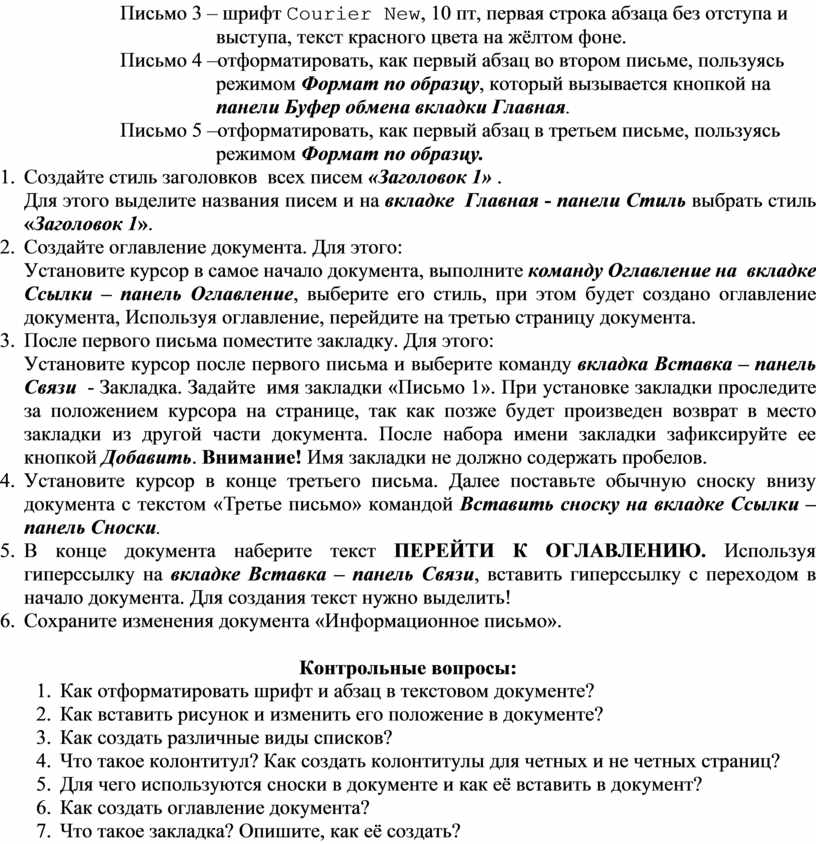 Письмо 4 –отформатировать, как первый абзац во втором письме, пользуясь режимом Формат по образцу, который вызывается кнопкой на панели Буфер обмена вкладки Главная.