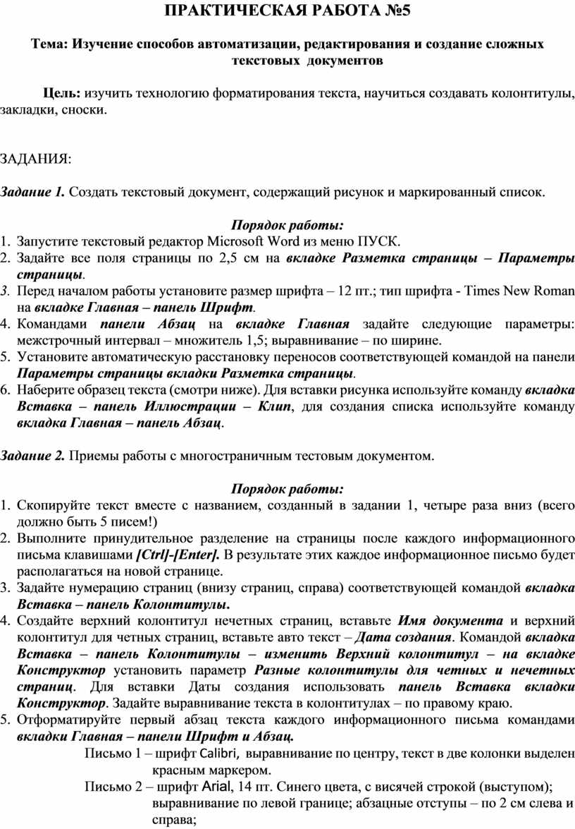 Цель: изучить технологию форматирования текста, научиться создавать колонтитулы, закладки, сноски.
