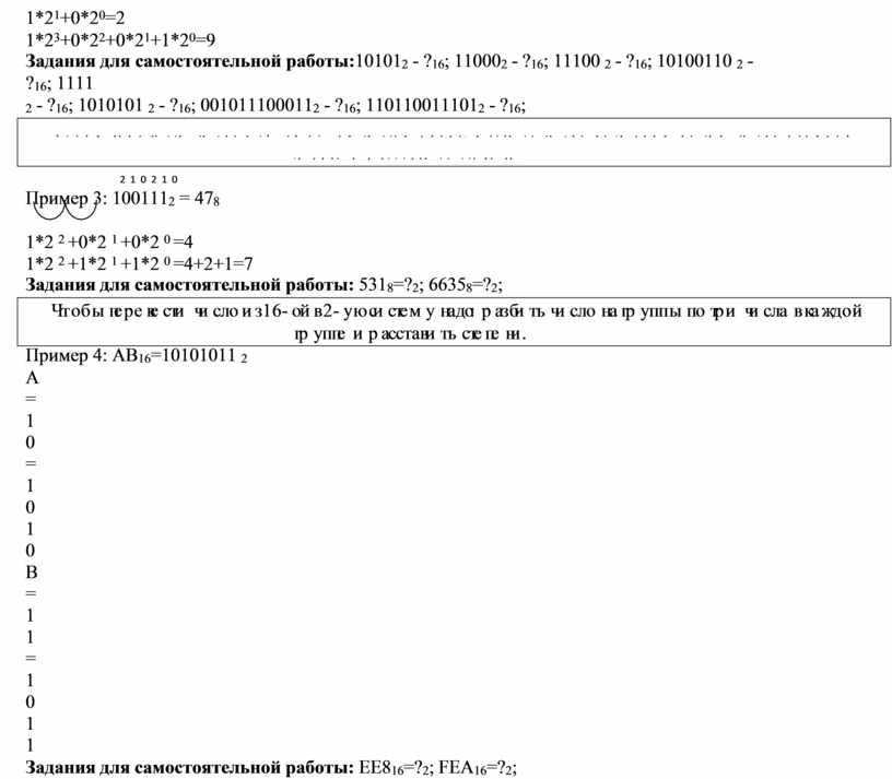 Задания для самостоятельной работы:100002 - ?8; 110002 - ?8; 111102 - ?8; 0101001102 - ?8; 1111 2 -
