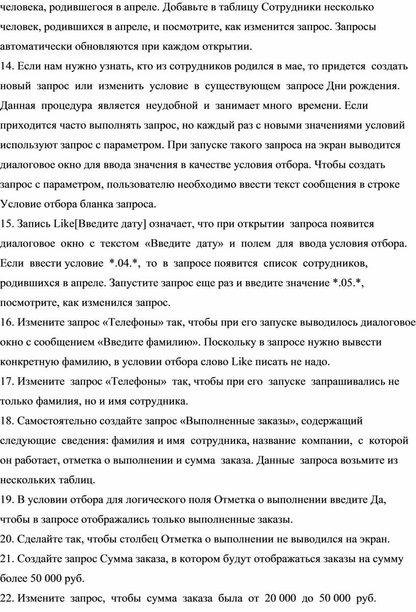 14. Если нам нужно узнать, кто из сотрудников родился в мае, то придется создать новый запрос или изменить условие в существующем запросе Дни рождения. Данная процедура является неудобной и занимает много времени. Если приходится часто выполнять запрос, но каждый раз с новыми значениями условий используют запрос с параметром. При запуске такого запроса на экран выводится диалоговое окно для ввода значения в качестве условия отбора. Чтобы создать запрос с параметром, пользователю необходимо ввести текст сообщения в строке Условие отбора бланка запроса.