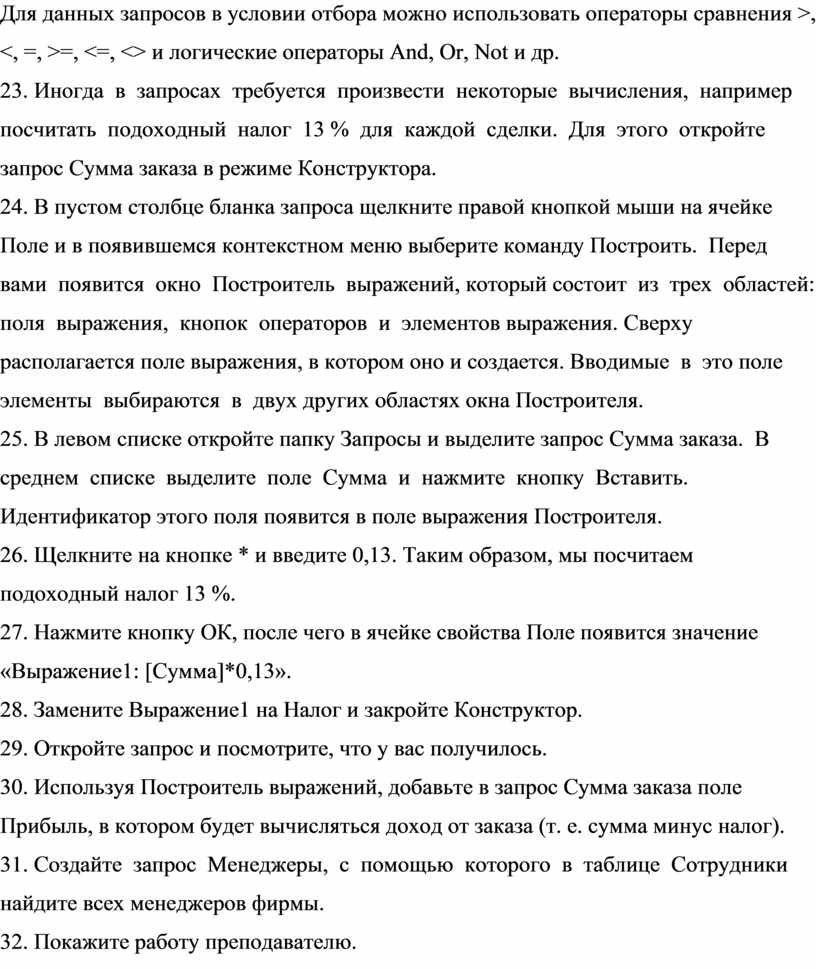23. Иногда в запросах требуется произвести некоторые вычисления, например посчитать подоходный налог 13 % для каждой сделки. Для этого откройте запрос Сумма заказа в режиме Конструктора.
