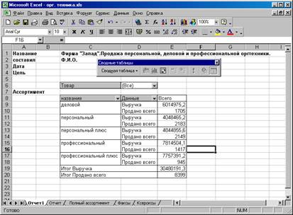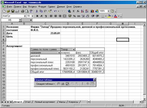 В сводной таблице содержатся поля, подводящие итоги исходных данных в нескольких строках. Переместив кнопку поля в другое место сводной таблицы, можно изменить представление данных