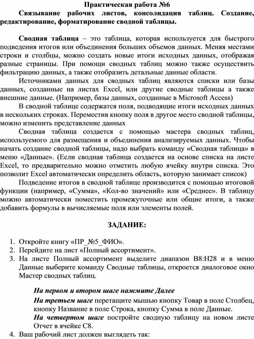 Связывание рабочих листов, консолидация таблиц. Создание, редактирование, форматирование сводной таблицы.