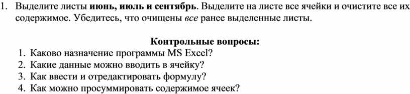 8. Выделите листы июнь, июль и сентябрь. Выделите на листе все ячейки и очистите все их содержимое. Убедитесь, что очищены все ранее выделенные листы.