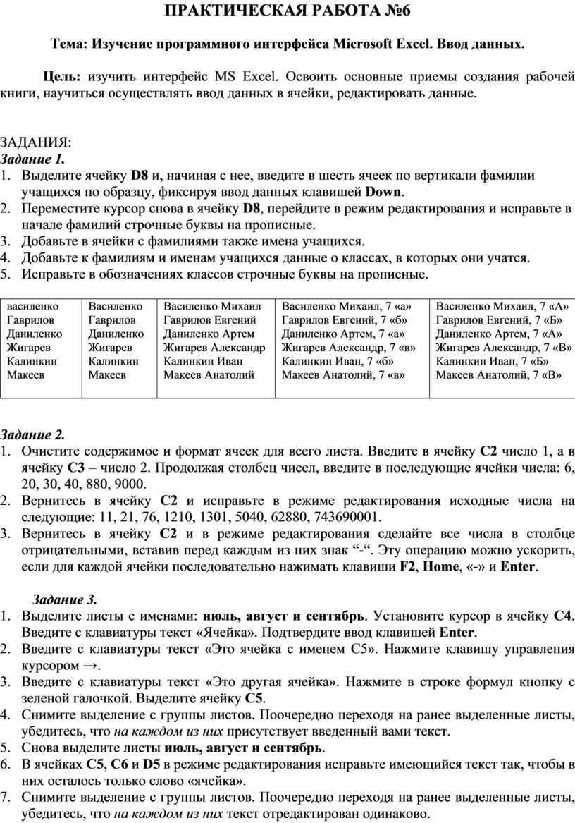 1. Выделите ячейку D8 и, начиная с нее, введите в шесть ячеек по вертикали фамилии учащихся по образцу, фиксируя ввод данных клавишей Down.
