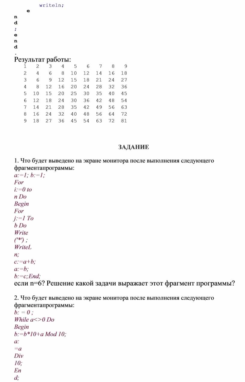 2. Что будет выведено на экране монитора после выполнения следующего фрагмента программы: