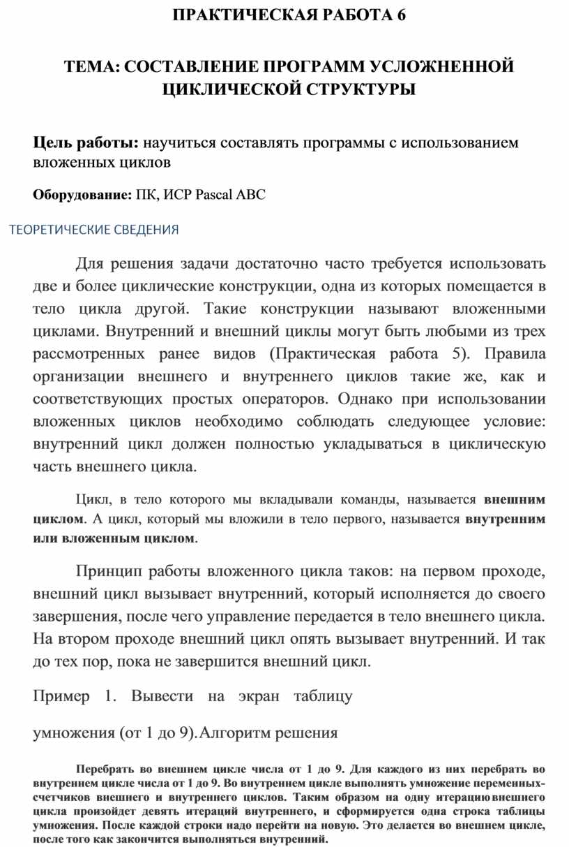 Для решения задачи достаточно часто требуется использовать две и более циклические конструкции, одна из которых помещается в тело цикла другой. Такие конструкции называют вложенными циклами. Внутренний и внешний циклы могут быть любыми из трех рассмотренных ранее видов (Практическая работа 5). Правила организации внешнего и внутреннего циклов такие же, как и соответствующих простых операторов. Однако при использовании вложенных циклов необходимо соблюдать следующее условие: внутренний цикл должен полностью укладываться в циклическую часть внешнего цикла.