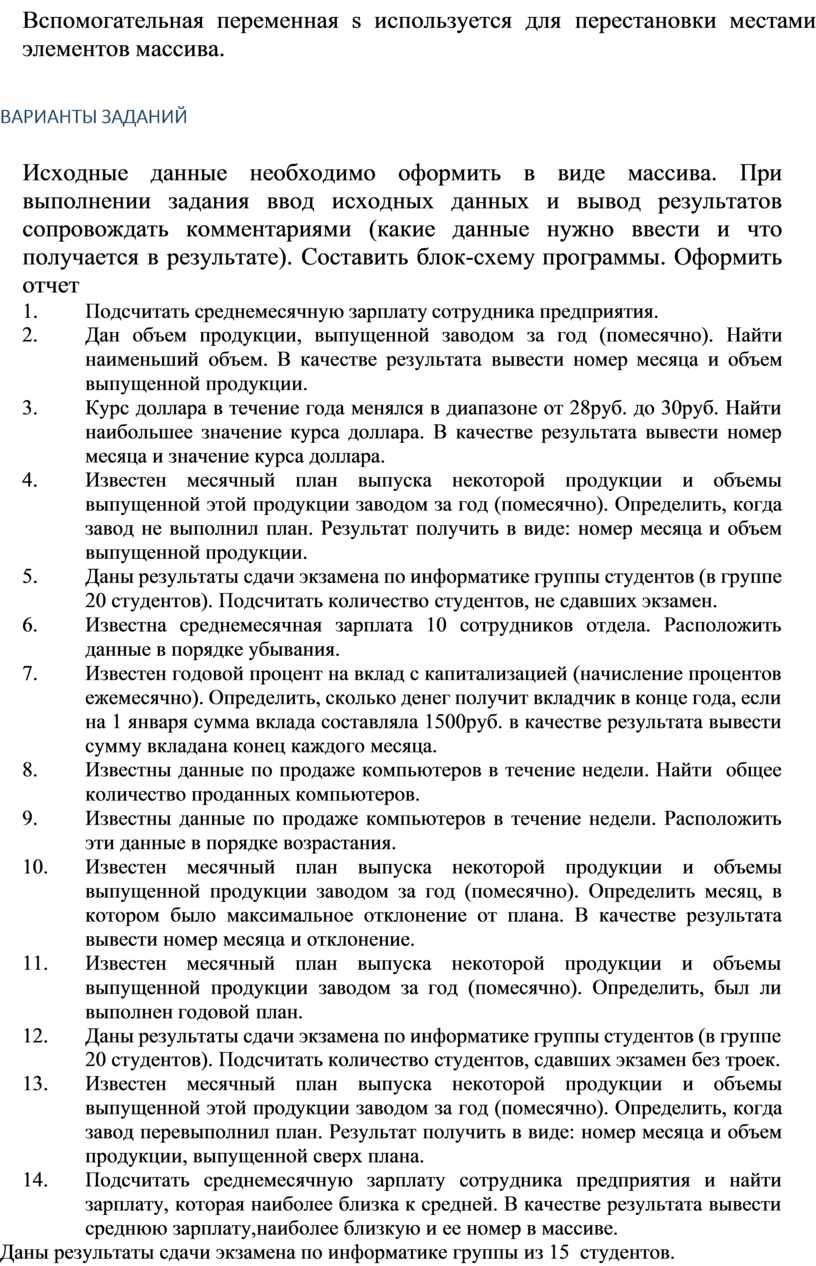 Исходные данные необходимо оформить в виде массива. При выполнении задания ввод исходных данных и вывод результатов сопровождать комментариями (какие данные нужно ввести и что получается в результате). Составить блок-схему программы. Оформить отчет