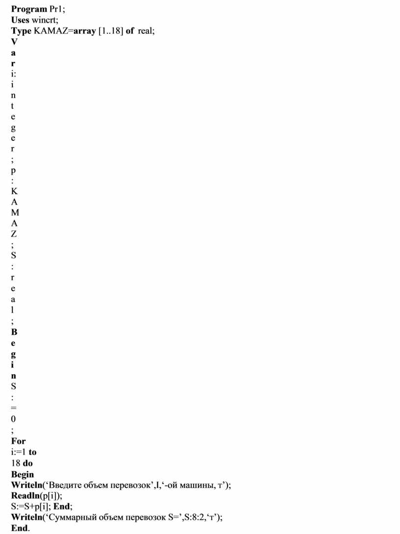 Writeln(‘Суммарный объем перевозок S=’,S:8:2,‘т’);