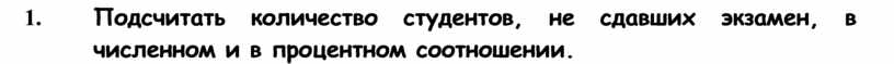 15. Даны результаты сдачи экзамена по информатике группы из 15 студентов. Подсчитать количество студентов, не сдавших экзамен, в численном и в процентном соотношении.
