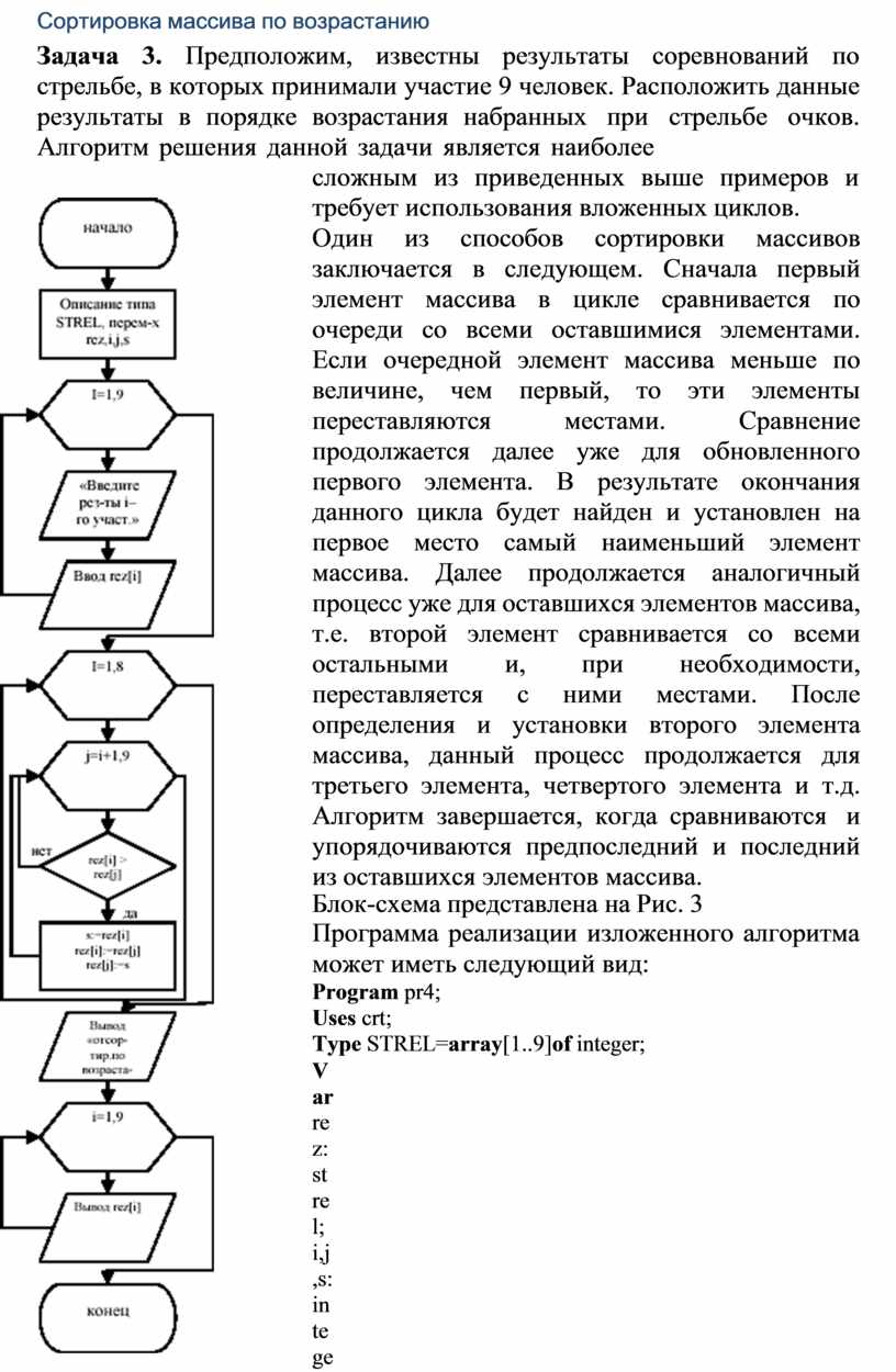 Задача 3. Предположим, известны результаты соревнований по стрельбе, в которых принимали участие 9 человек. Расположить данные результаты в порядке возрастания набранных при стрельбе очков. Алгоритм решения данной задачи является наиболее