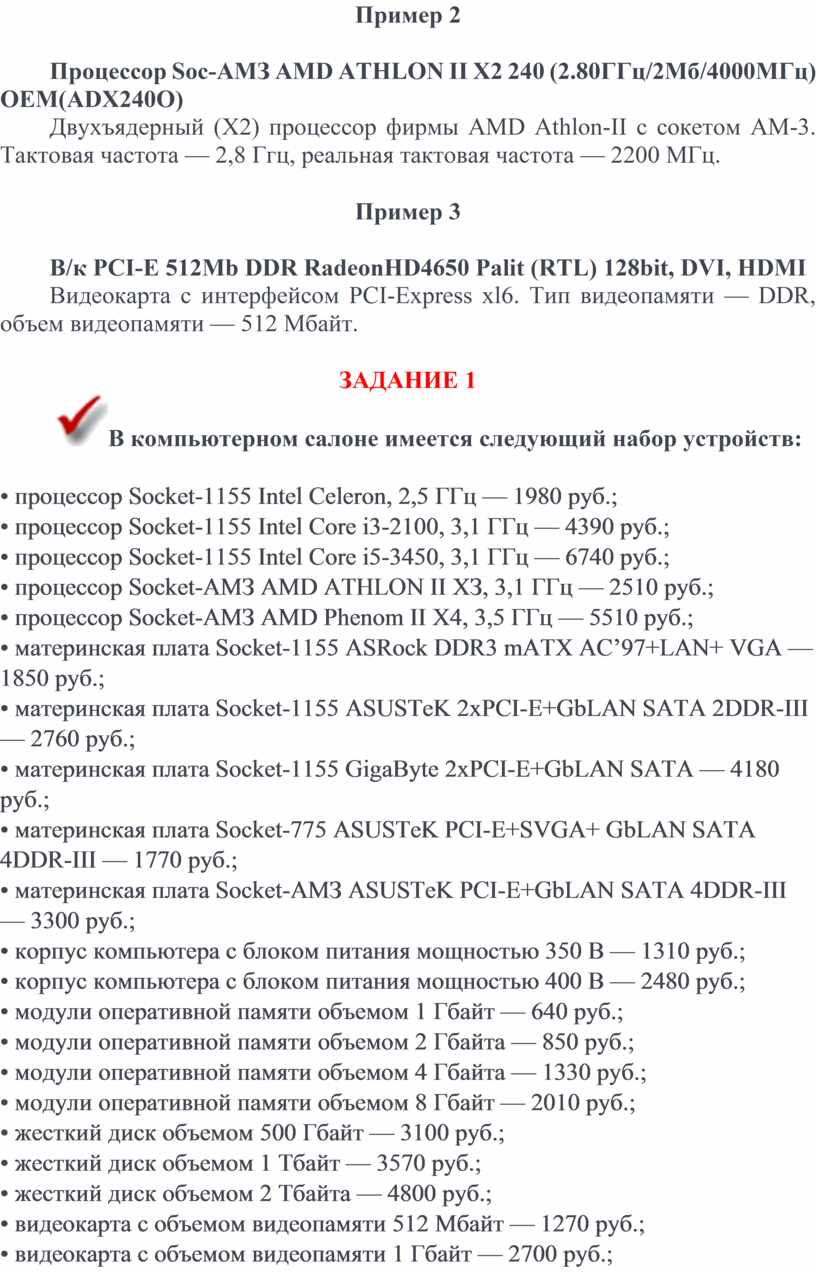 Подобрать комплектующие для компьютера, предназначенного для решения определенного круга задач (см. варианты ниже). При выборе компонент компьютера необходимо уложиться в заданную сумму. Для подбора различных вариантов решения указанной задачи использовать табличный процессор (электронные таблицы).