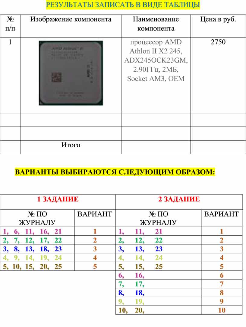 При выборе компонент компьютера необходимо уложиться в заданную сумму. Для подбора различных вариантов решения указанной задачи использовать табличный процессор (электронные таблицы). Все компоненты должны стыковаться с материнской платой по интерфейсу подключения и пропускной способности.