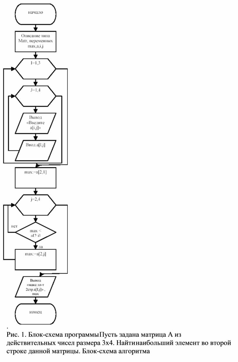 действительных чисел размера 3х4. Найти наибольший элемент во второй строке данной матрицы. Блок-схема алгоритма