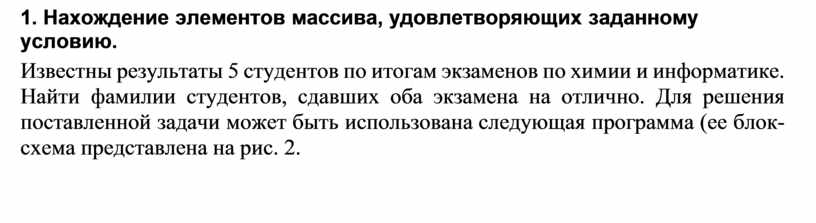 Известны результаты 5 студентов по итогам экзаменов по химии и информатике. Найти фамилии студентов, сдавших оба экзамена на отлично. Для решения поставленной задачи может быть использована следующая программа (ее блок-схема представлена на рис. 2.