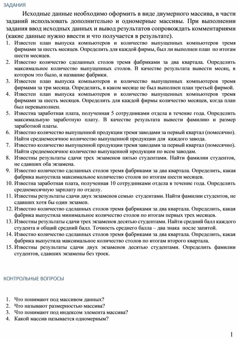Исходные данные необходимо оформить в виде двумерного массива, в части заданий использовать дополнительно и одномерные массивы. При выполнении задания ввод исходных данных и вывод результатов сопровождать комментариями (какие данные нужно ввести и что получается в результате).