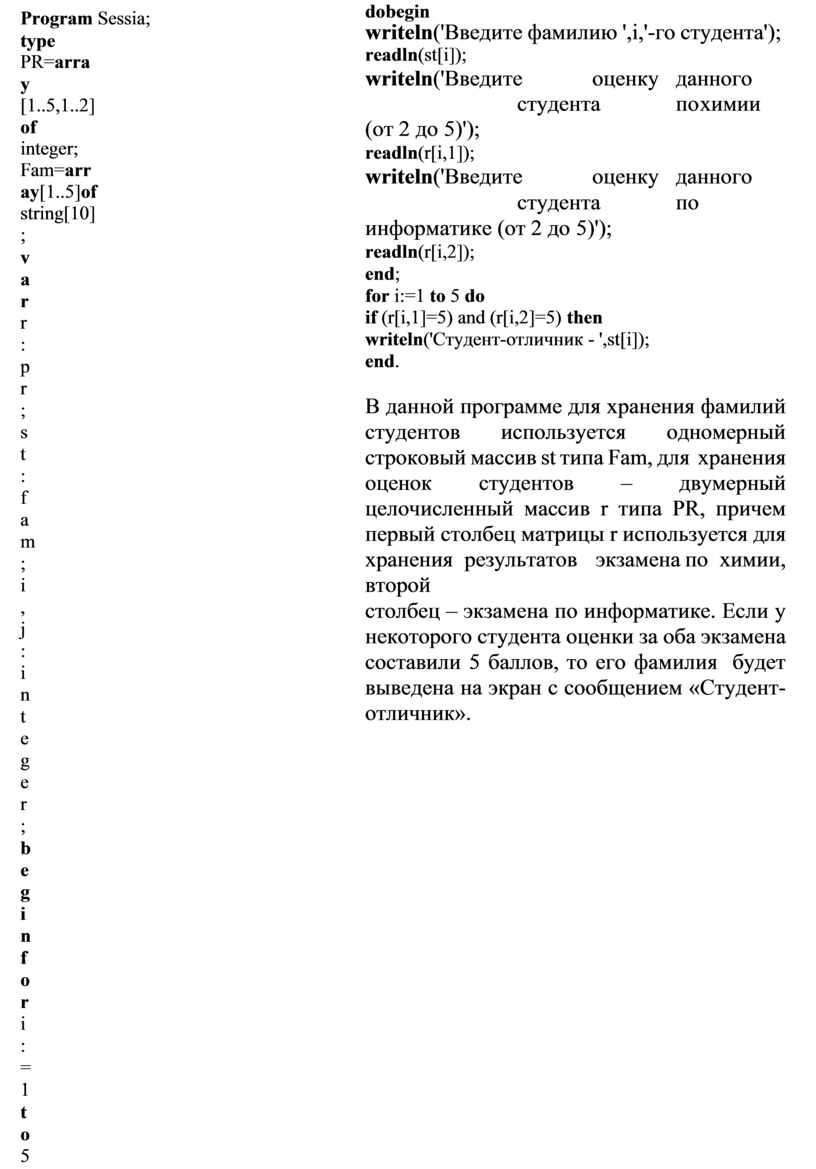 В данной программе для хранения фамилий студентов используется одномерный строковый массив st типа Fam, для хранения оценок студентов – двумерный целочисленный массив r типа PR, причем первый столбец матрицы r используется для хранения результатов экзамена по химии, второй