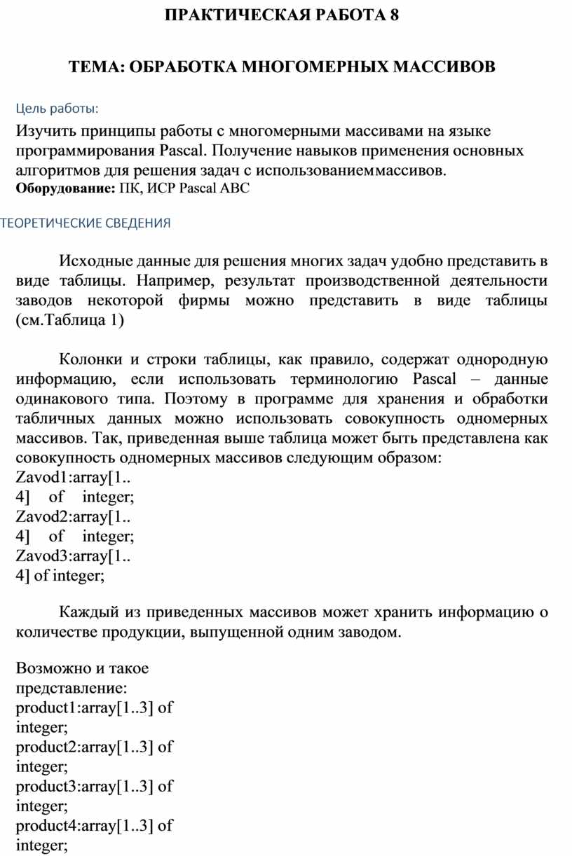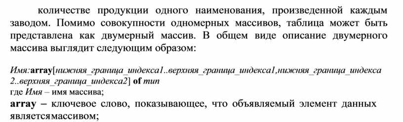В этом случае массив предназначен для хранения информации о количестве продукции одного наименования, произведенной каждым заводом. Помимо совокупности одномерных массивов, таблица может быть представлена как двумерный массив. В общем виде описание двумерного массива выглядит следующим образом: