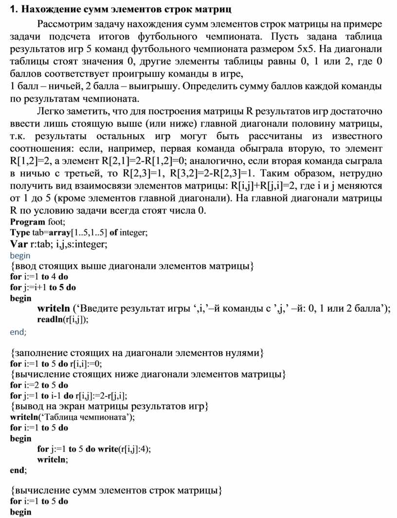 Рассмотрим задачу нахождения сумм элементов строк матрицы на примере задачи подсчета итогов футбольного чемпионата. Пусть задана таблица результатов игр 5 команд футбольного чемпионата размером 5х5. На диагонали таблицы стоят значения 0, другие элементы таблицы равны 0, 1 или 2, где 0 баллов соответствует проигрышу команды в игре,