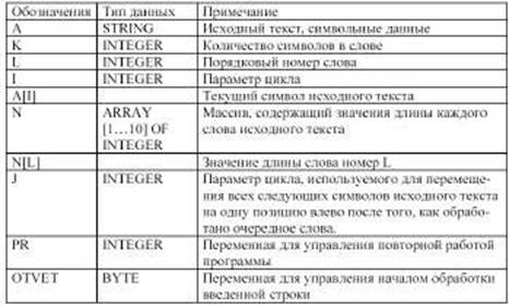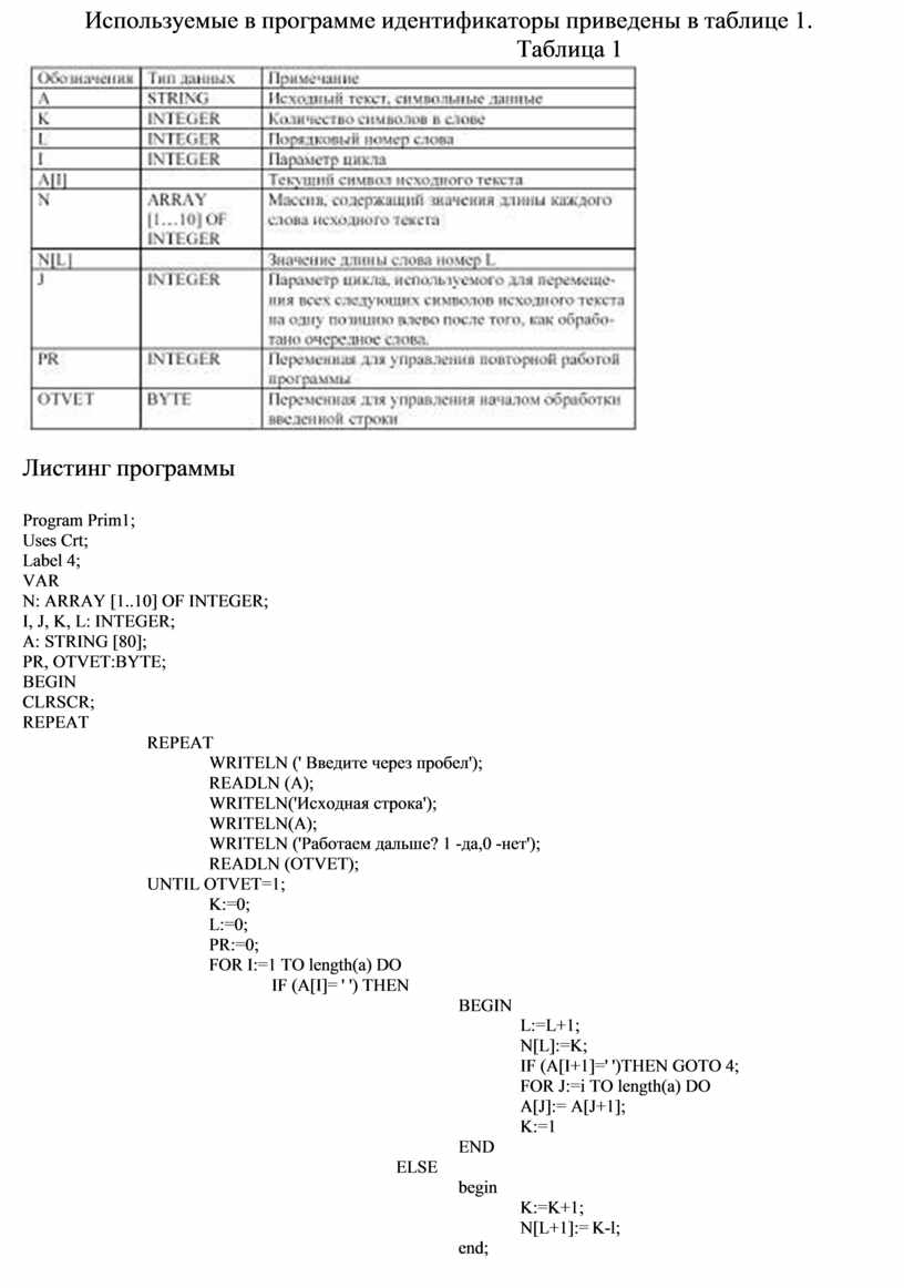 Используемые в программе идентификаторы приведены в таблице 1.