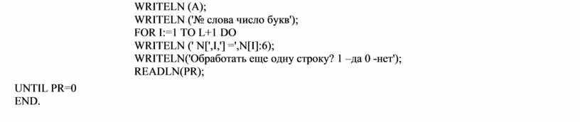 WRITELN('Обработать еще одну строку? 1 –да 0 -нет'); READLN(PR);