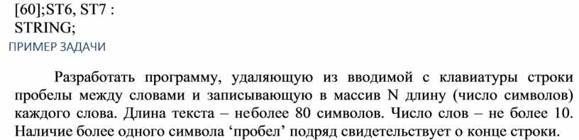 Разработать программу, удаляющую из вводимой с клавиатуры строки пробелы между словами и записывающую в массив N длину (число символов) каждого слова. Длина текста – не более 80 символов. Число слов – не более 10. Наличие более одного символа ‘пробел’ подряд свидетельствует о конце строки.