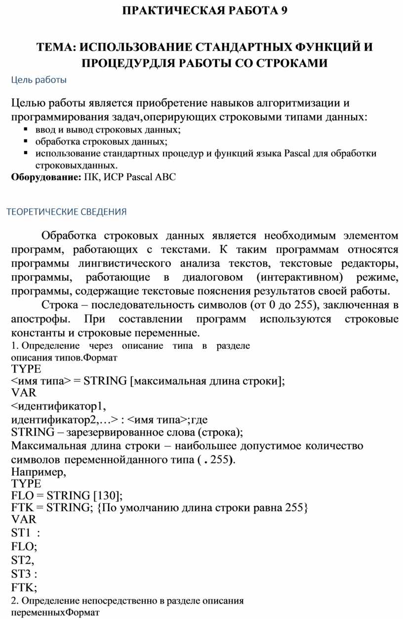 ТЕМА: ИСПОЛЬЗОВАНИЕ СТАНДАРТНЫХ ФУНКЦИЙ И ПРОЦЕДУР ДЛЯ РАБОТЫ СО СТРОКАМИ