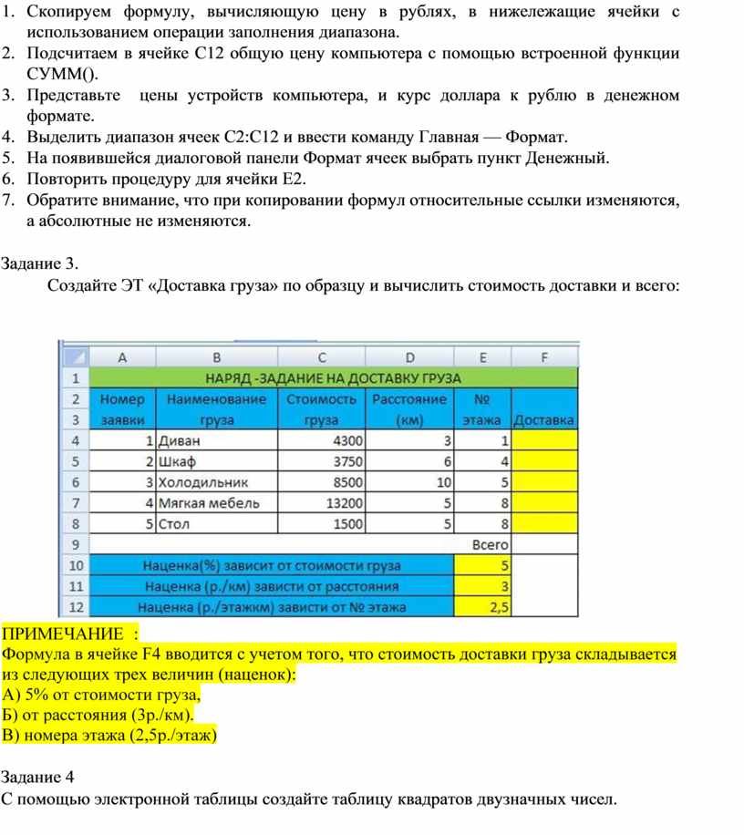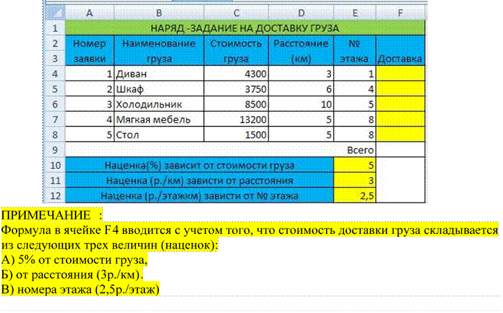 Создайте ЭТ «Доставка груза» по образцу и вычислить стоимость доставки и всего: