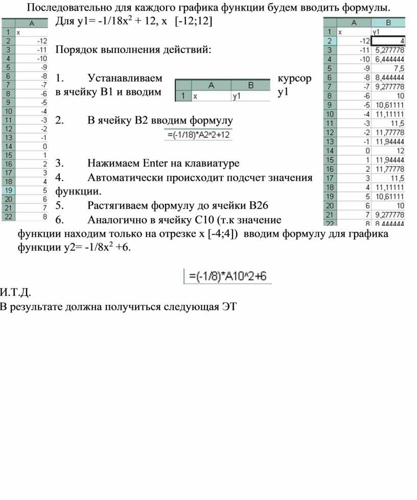 6. Аналогично в ячейку С10 (т.к значение функции находим только на отрезке х [-4;4]) вводим формулу для графика функции y2= -1/8х2 +6.