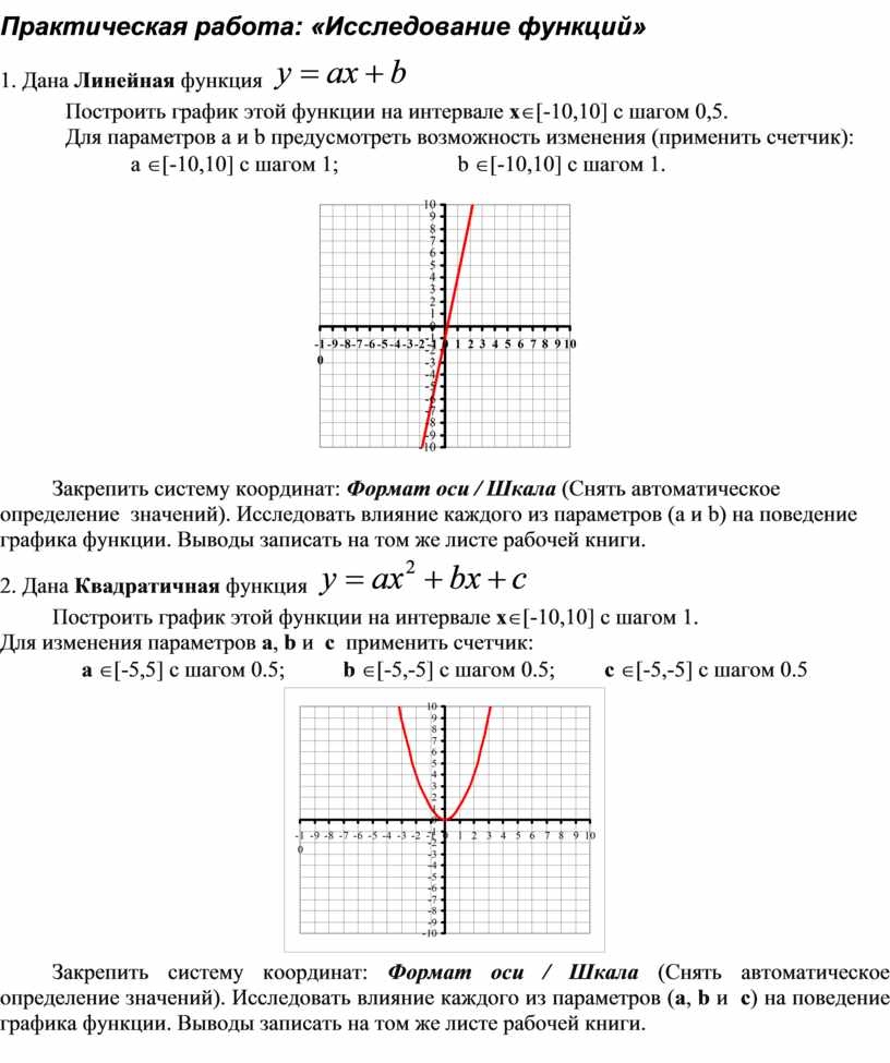 Закрепить систему координат: Формат оси / Шкала (Снять автоматическое определение значений). Исследовать влияние каждого из параметров (a и b) на поведение графика функции. Выводы записать на том же листе рабочей книги.