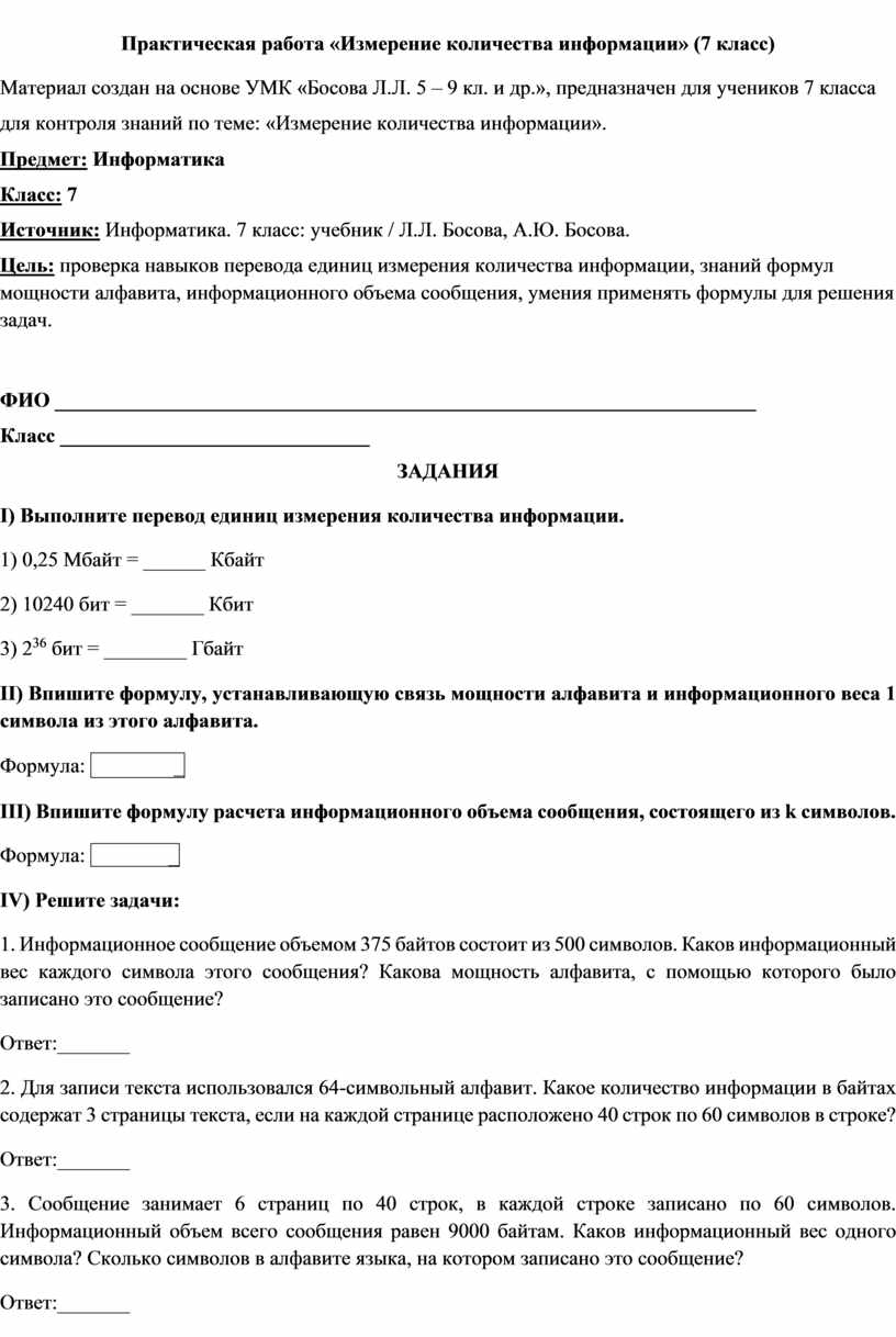 Практическая работа «Измерение количества информации» (7 класс)