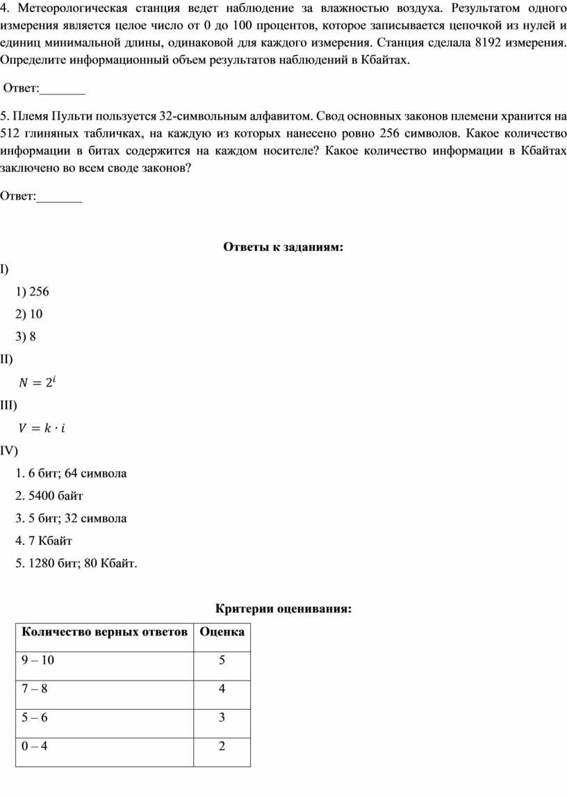 4. Метеорологическая станция ведет наблюдение за влажностью воздуха. Результатом одного измерения является целое число от 0 до 100 процентов, которое записывается цепочкой из нулей и единиц минимальной длины, одинаковой для каждого измерения. Станция сделала 8192 измерения. Определите информационный объем результатов наблюдений в Кбайтах.