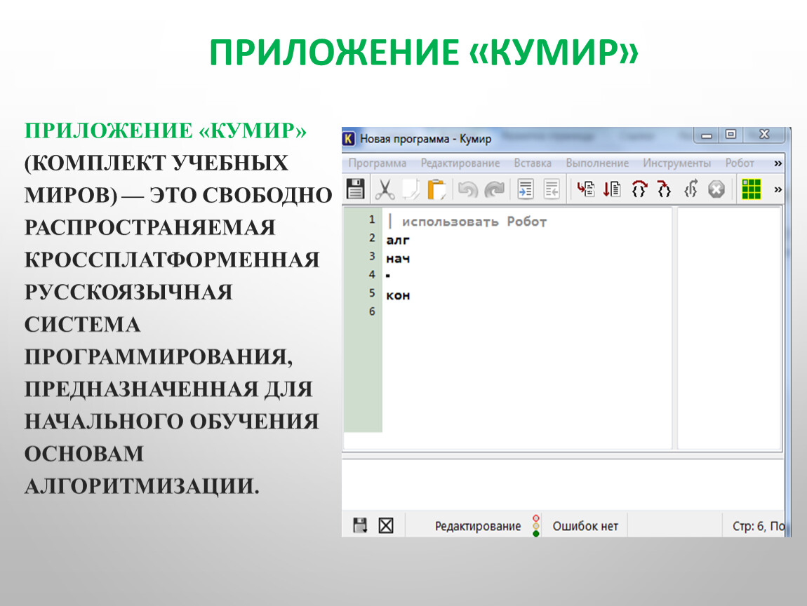 Приложение «КуМир» (Комплект Учебных МИРов) — это свободно распространяемая кроссплатформенная русскоязычная система программирования, предназначенная для начального обучения основам алгоритмизации.