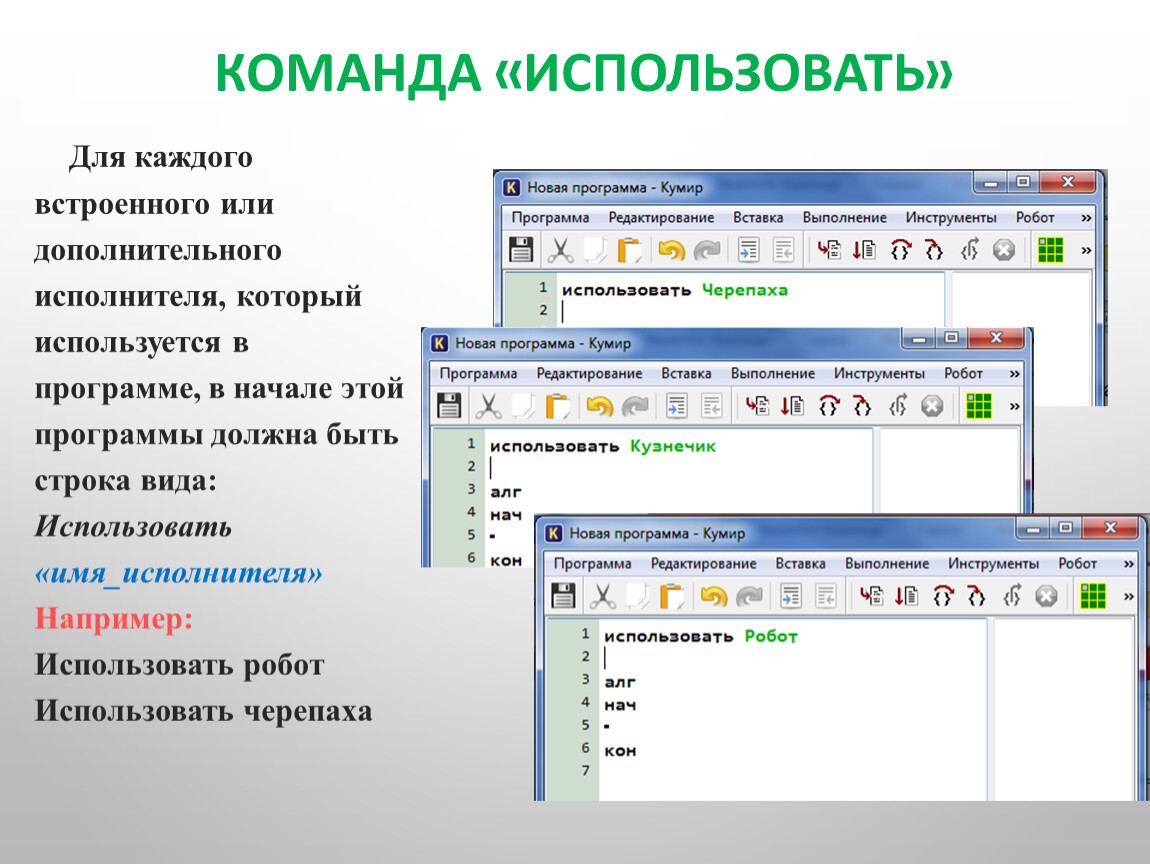 Для каждого встроенного или дополнительного исполнителя, который используется в программе, в начале этой программы должна быть строка вида: