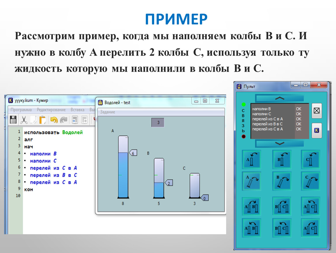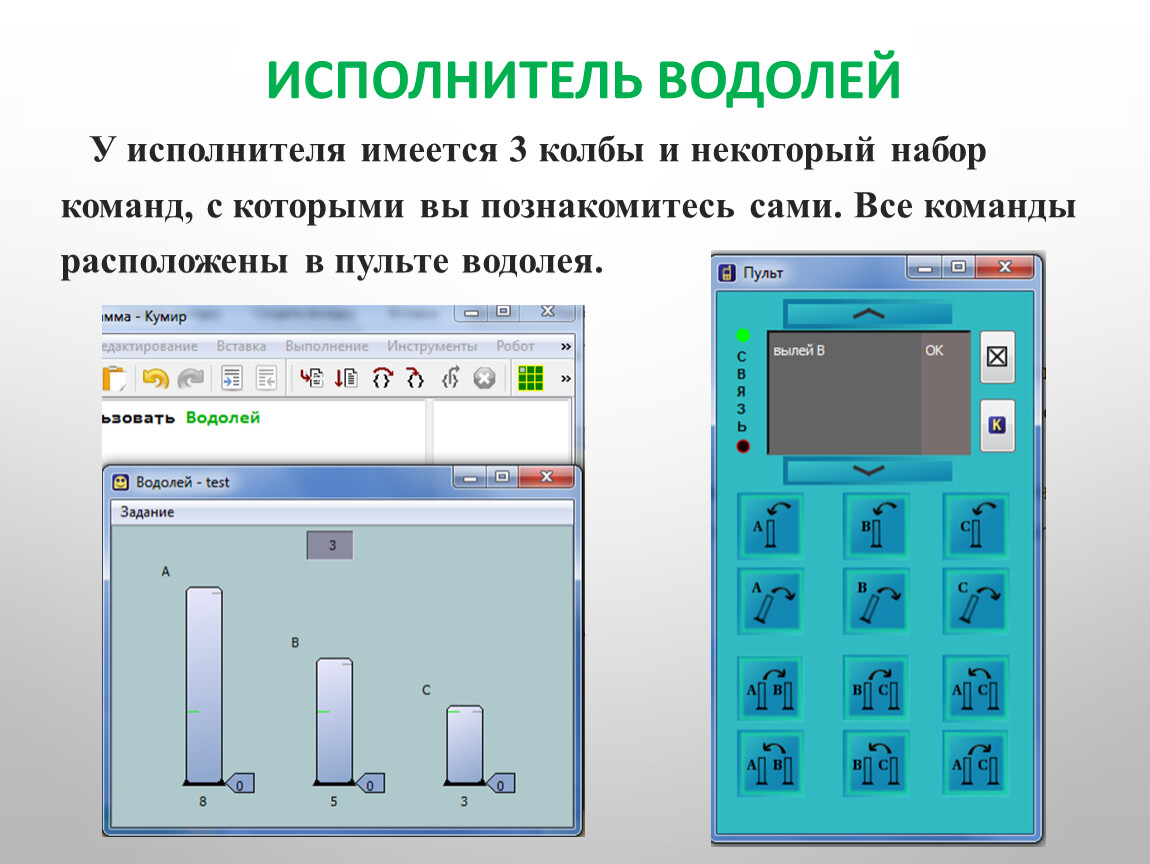У исполнителя имеется 3 колбы и некоторый набор команд, с которыми вы познакомитесь сами. Все команды расположены в пульте водолея.