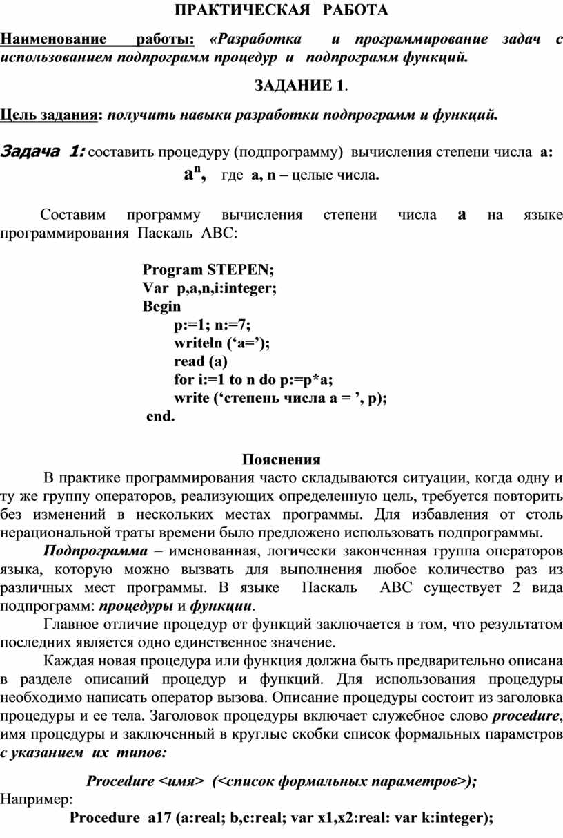 Задача 1: составить процедуру (подпрограмму) вычисления степени числа a: