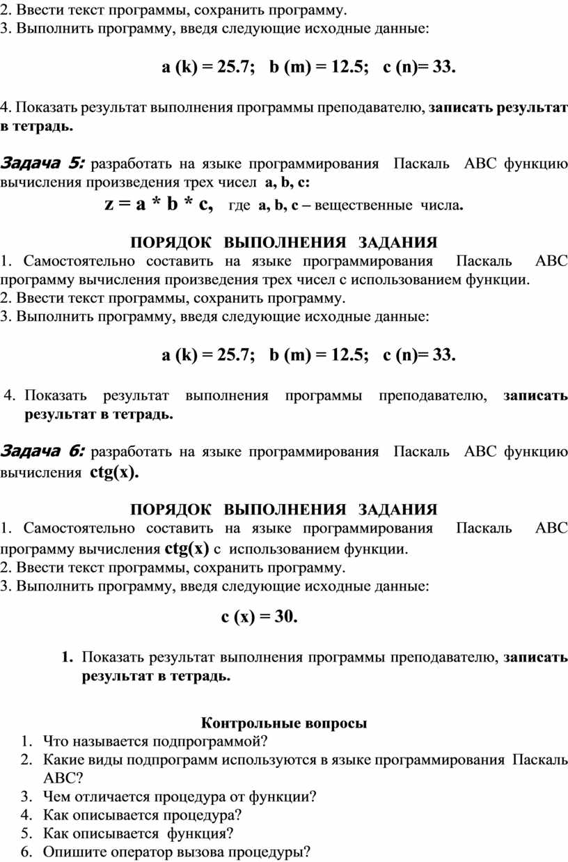 1. Самостоятельно составить на языке программирования Паскаль АВС программу вычисления ctg(x) с использованием функции.