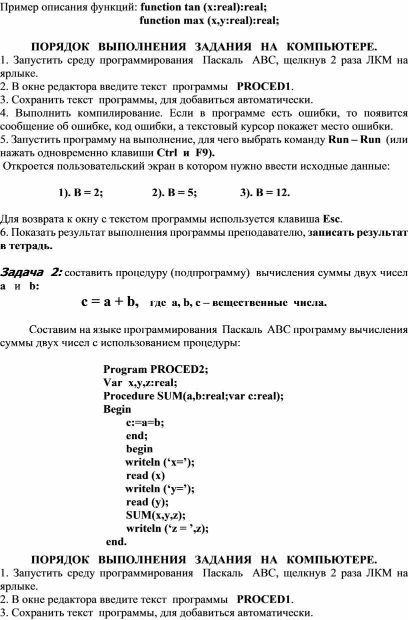 Цель задания: закрепить навыки программирования задач с использованием процедур и функций, а также навыки работы в среде программирования Паскаль АВС.