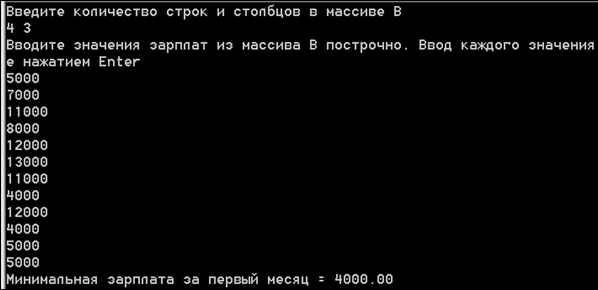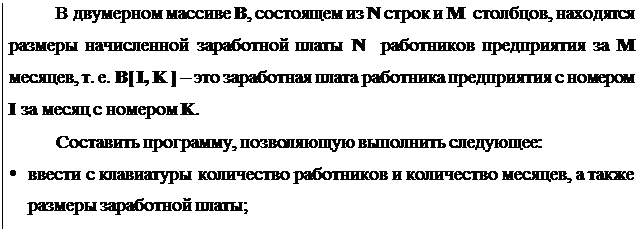 Задание. В двумерном массиве B, состоящем из N строк и M столбцов, находятся размеры начисленной заработной платы N работников предприятия за M месяцев, т. е. B[ I, K ] – это заработная плата работника предприятия с номером I за месяц с номером K.