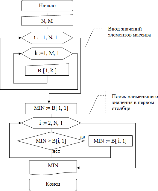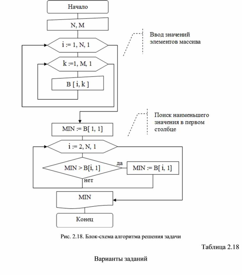 Определение наименьшего значения элементов первого столбца (MIN) выполняется попарным сравнением элементов, при этом второй индекс элементов массива будет неизменным и равным 1. Блок-схема алгоритма решения задачи показана на рис. 2.18.