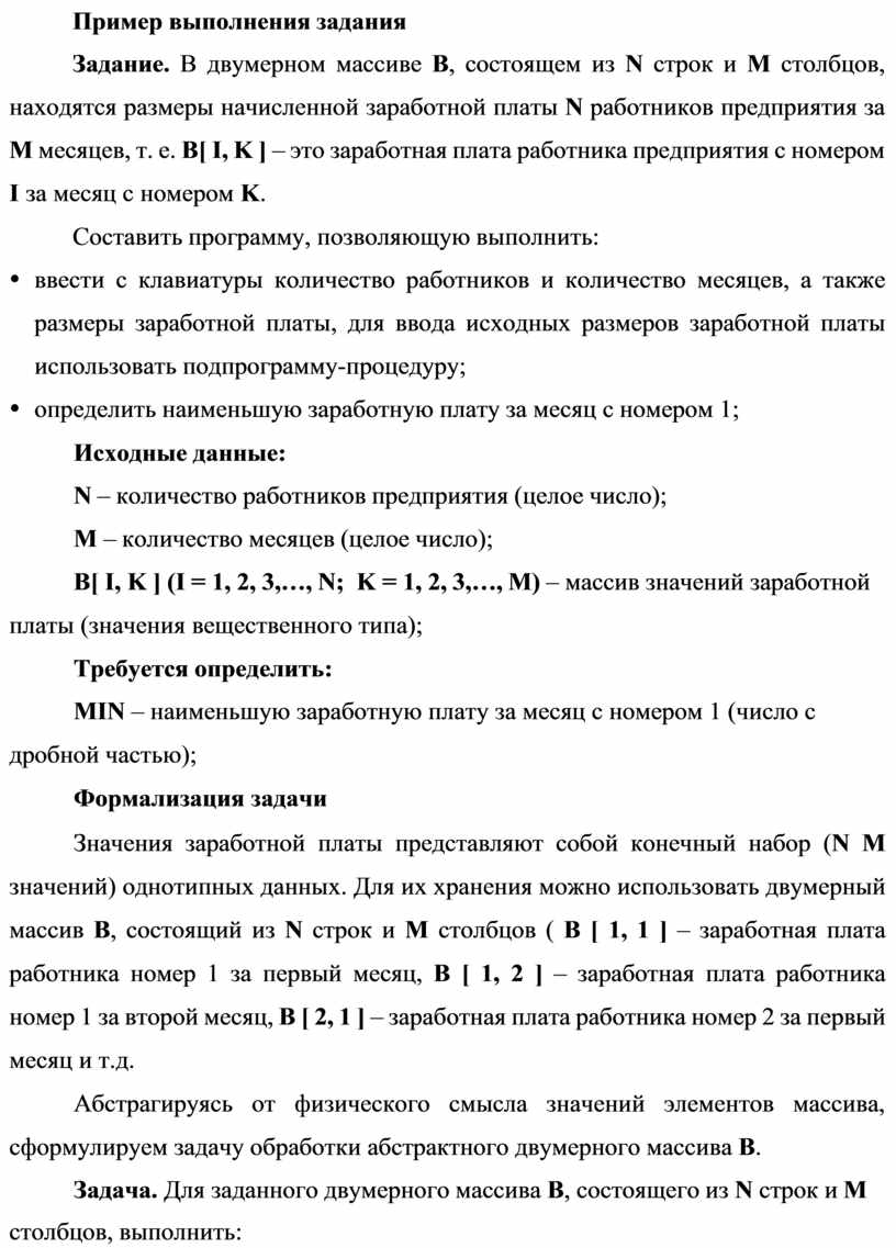 B[ I, K ] (I = 1, 2, 3,…, N; K = 1, 2, 3,…, M) – массив значений заработной платы (значения вещественного типа);