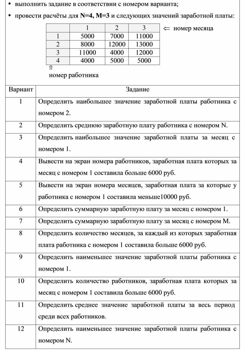 Ÿ выполнить задание в соответствии с номером варианта; Ÿ провести расчёты для N=4, M=3 и следующих значений заработной платы: Ü номер месяца
