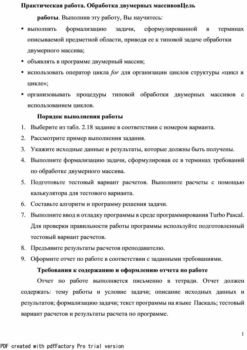 Ÿ организовывать процедуры типовой обработки двумерных массивов с использованием циклов.