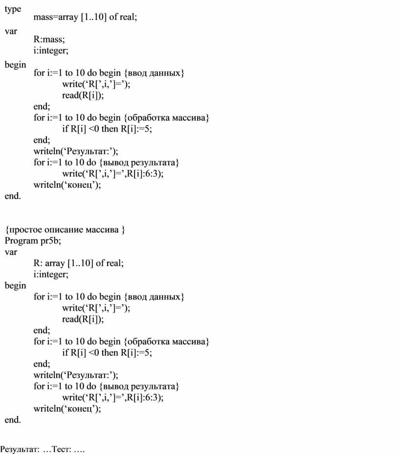 for i:=1 to 10 do begin {обработка массива} if R[i] <0 then R[i]:=5;