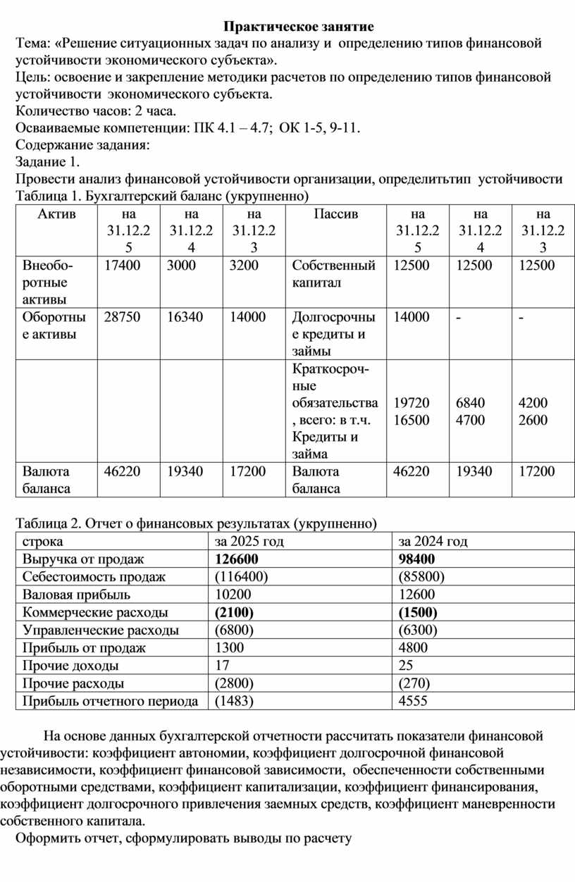 Тема: «Решение ситуационных задач по анализу и определению типов финансовой устойчивости экономического субъекта».