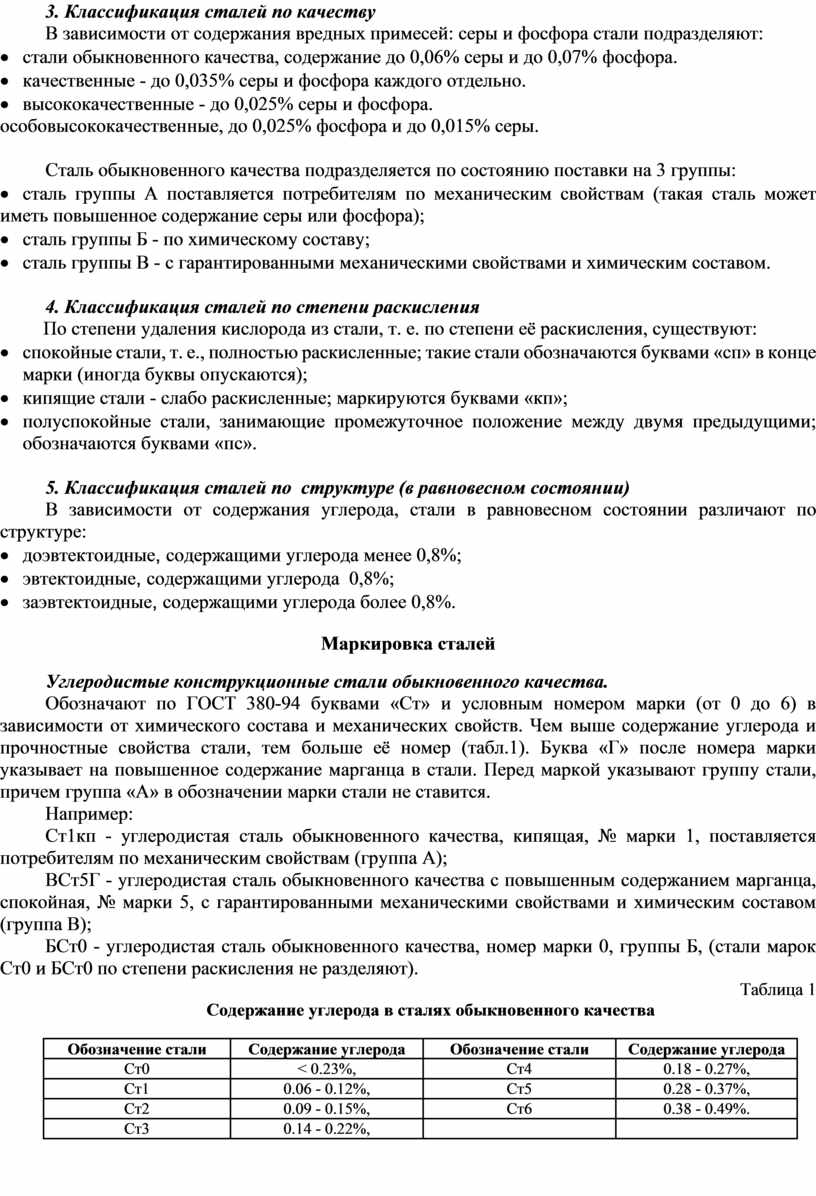 Обозначают по ГОСТ 380-94 буквами «Ст» и условным номером марки (от 0 до 6) в зависимости от химического состава и механических свойств. Чем выше содержание углерода и прочностные свойства стали, тем больше её номер (табл.1). Буква «Г» после номера марки указывает на повышенное содержание марганца в стали. Перед маркой указывают группу стали, причем группа «А» в обозначении марки стали не ставится.