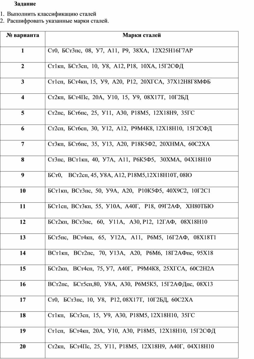 4. Записать характеристику стали в соответствии с данными таблицы 1 (расшифровать каждую марку стали).
