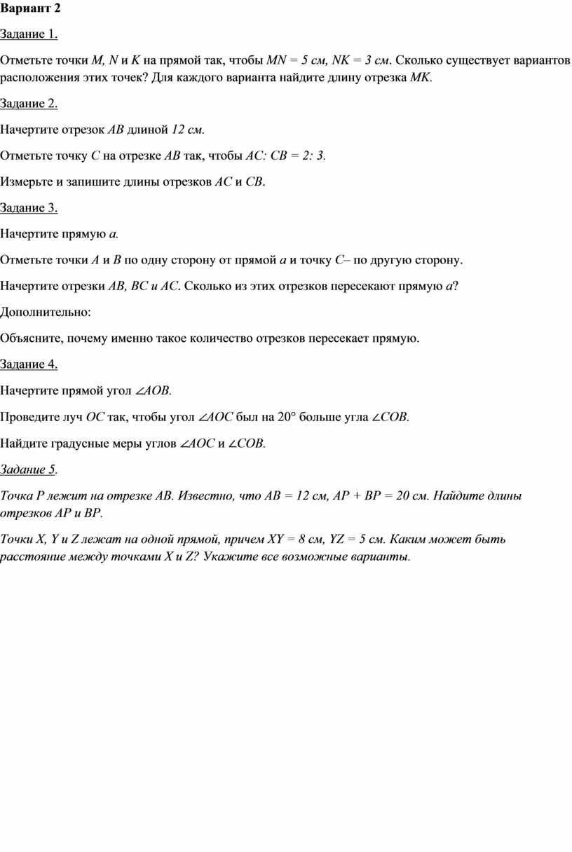 Практическая работа по теме "Отрезки и полуплоскости" предназначена для учащихся 7 класса, освоивших базовые понятия темы, направлена на развитие навыков решения задач, требующих анализа условия, рассмотрения различных вариантов и логического обоснования своих ответов. Наличие двух вариантов позволяет использовать работу для самостоятельного выполнения при минимизации возможности списывания.