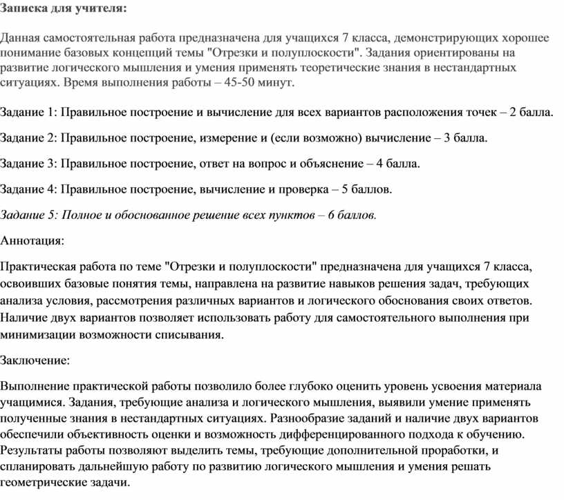 Данная самостоятельная работа предназначена для учащихся 7 класса, демонстрирующих хорошее понимание базовых концепций темы "Отрезки и полуплоскости". Задания ориентированы на развитие логического мышления и умения применять теоретические знания в нестандартных ситуациях. Время выполнения работы – 45-50 минут.
